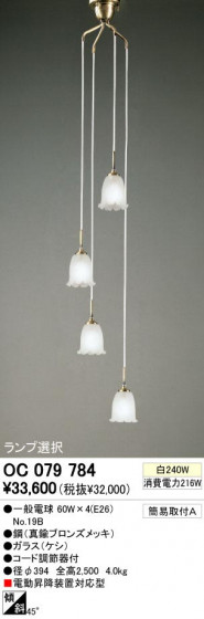 寸法:径φ394 全高2,500 重量:4kg 材質:●鋼(真鍮ブロンズメッキ)|●ガラス(ケシ) 総W数:240W 省エネ達成率: ランプ名称:一般電球 ランプ本数:4本 光源色: 傾斜取付45°可能 電動昇降装置対応型