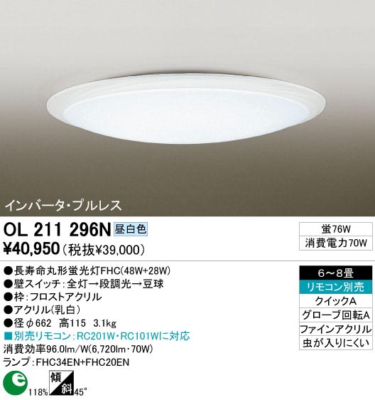 寸法:径φ662 高115 重量:3.1kg 材質:●枠:フロストアクリル|●アクリル(乳白) 総W数:76W 省エネ達成率:1.18 ランプ名称:長寿命丸形蛍光灯FHC(48W+28W) ランプ本数:2本 光源色:昼白色 傾斜取付45°可能