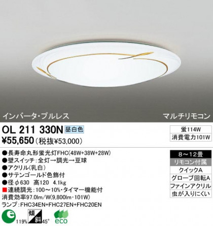 寸法:径φ630 高120 重量:4.1kg 材質:●アクリル(乳白)|●サテンゴールド色飾付 総W数:114W 省エネ達成率:1.19 ランプ名称:長寿命丸形蛍光灯FHC(48W+38W+28W) ランプ本数:3本 光源色:昼白色 傾斜取付45°可能 連続調光:100〜10%・タイマー機能付