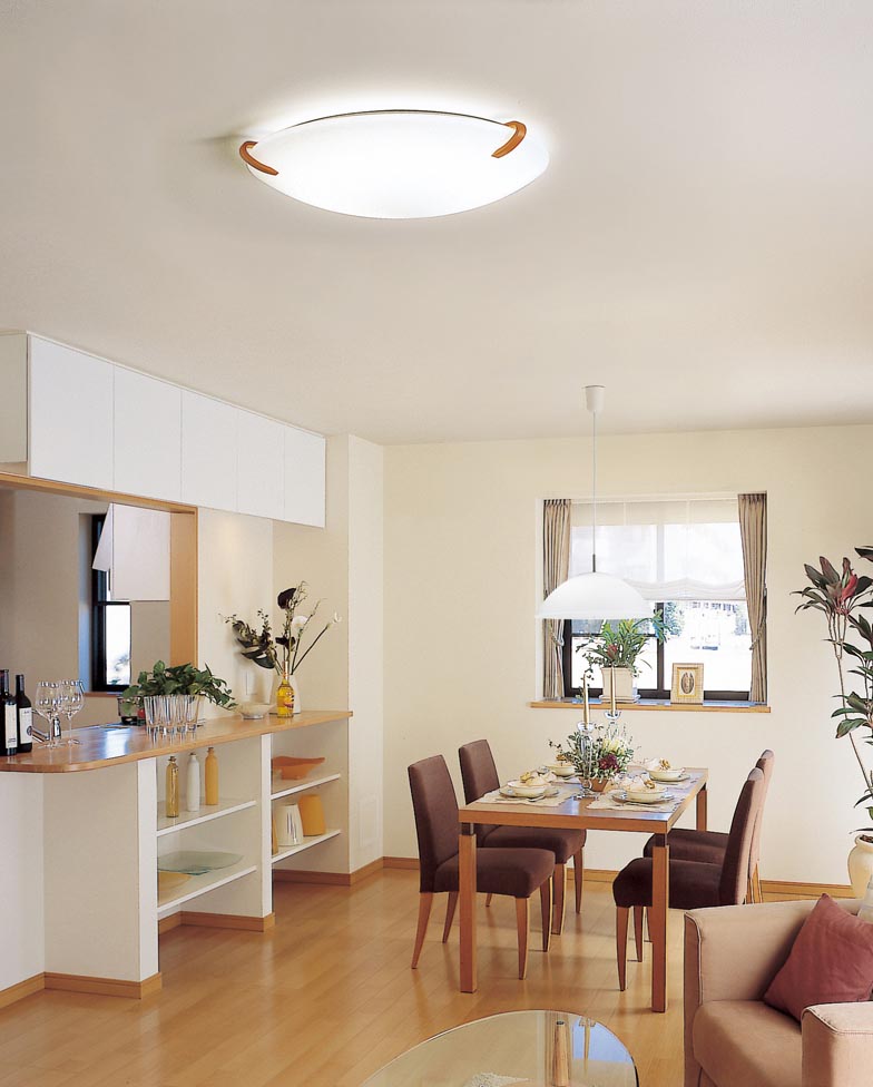 寸法:径φ623 高115 重量:2.6kg 材質:●ブナ材(チェリー色仕上)|●アクリル(乳白) 総W数:76W 省エネ達成率:1.18 ランプ名称:長寿命丸形蛍光灯FHC(48W+28W) ランプ本数:2本 光源色:昼白色 傾斜取付45°可能