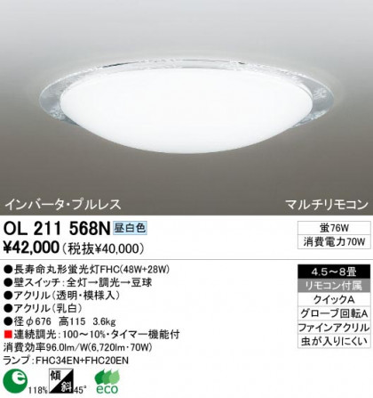 寸法:径φ676 高115 重量:3.6kg 材質:●アクリル(透明・模様入)|●アクリル(乳白) 総W数:76W 省エネ達成率:1.18 ランプ名称:長寿命丸形蛍光灯FHC(48W+28W) ランプ本数:2本 光源色:昼白色 傾斜取付45°可能 連続調光:100〜10%・タイマー機能付