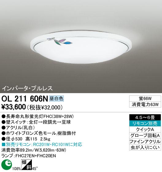 寸法:径φ530 高115 重量:2.5kg 材質:●アクリル(乳白)|●ホワイトブロンズ色モール、樹脂飾付 総W数:66W 省エネ達成率:1.08 ランプ名称:長寿命丸形蛍光灯FHC(38W+28W) ランプ本数:2本 光源色:昼白色 傾斜取付45°可能