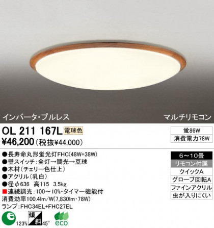 寸法:径φ636 高115 重量:3.5kg 材質:●木材(チェリー色仕上)|●アクリル(乳白) 総W数:86W 省エネ達成率:1.23 ランプ名称:長寿命丸形蛍光灯FHC(48W+38W) ランプ本数:2本 光源色:電球色 傾斜取付45°可能 連続調光:100〜10%・タイマー機能付