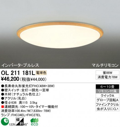 寸法:径φ636 高115 重量:3.5kg 材質:●木材(ナチュラル色仕上)|●アクリル(乳白) 総W数:86W 省エネ達成率:1.23 ランプ名称:長寿命丸形蛍光灯FHC(48W+38W) ランプ本数:2本 光源色:電球色 傾斜取付45°可能 連続調光:100〜10%・タイマー機能付