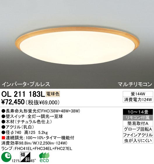寸法:径φ740 高125 重量:5.2kg 材質:●木材(ナチュラル色仕上)|●アクリル(乳白) 総W数:144W 省エネ達成率:1.21 ランプ名称:長寿命丸形蛍光灯FHC(58W+48W+38W) ランプ本数:3本 光源色:電球色 傾斜取付45°可能 連続調光:100〜10%・タイマー機能付