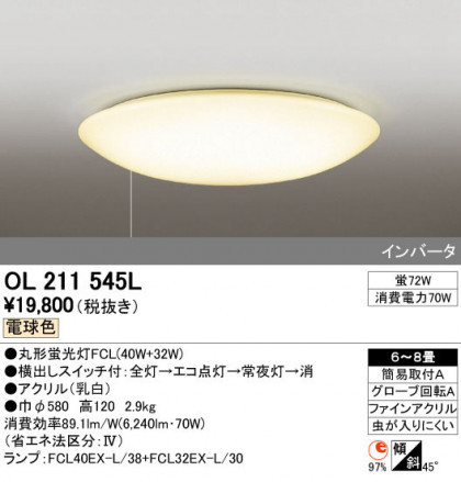 寸法:径φ580 高120 重量:2.9kg 材質:●アクリル(乳白) 総W数:72W 省エネ達成率:1.08 ランプ名称:丸形蛍光灯FCL(40W+32W) ランプ本数:2本 光源色:電球色 傾斜取付45°可能