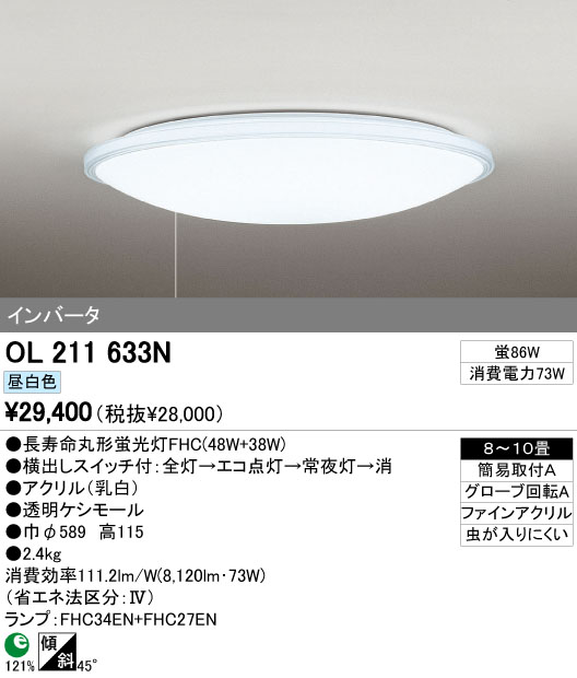 寸法:径φ589 高115 重量:2.4kg 材質:●アクリル(乳白) |●透明ケシモール 総W数:86W 省エネ達成率:1.23 ランプ名称:長寿命丸形蛍光灯FHC(48W+38W) ランプ本数:2本 光源色:昼白色 傾斜取付45°可能