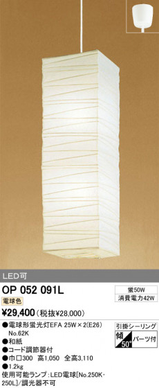 寸法:径□300 高1,050 全高3,110 重量:1.2kg 材質:●和紙 総W数:50W 省エネ達成率: ランプ名称:電球形蛍光灯EFA ランプ本数:2本 光源色:電球色