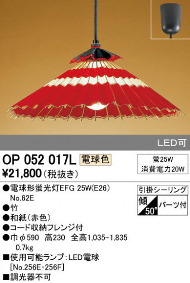 寸法:径φ590 高230 全高1,035〜1,835 重量:0.7kg 材質:●竹|●和紙(赤色) 総W数:25W 省エネ達成率: ランプ名称:電球形蛍光灯EFG ランプ本数:1本 光源色:電球色