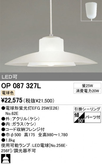 寸法:径φ500 高175 全高980〜1,780 重量:1.8kg 材質:●鋼(白色塗装)|●外側セード:アクリル(ケシ)|●内側セード:ガラス(ケシ) 総W数:25W 省エネ達成率: ランプ名称:電球形蛍光灯EFG ランプ本数:1本 光源色:電球色
