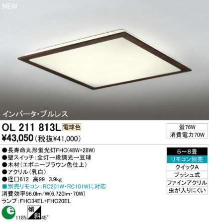 寸法:径□612 高99 重量:3.9kg 材質:●木材(エボニーブラウン色仕上)|●アクリル(乳白) 総W数:76W 省エネ達成率:1.18 ランプ名称:長寿命丸形蛍光灯FHC(48W+28W) ランプ本数:2本 光源色:電球色 傾斜取付45°可能