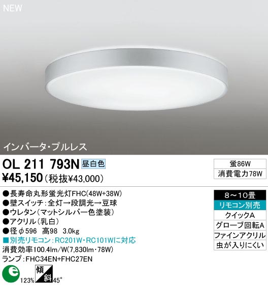 寸法:径φ596 高98 重量:3kg 材質:●ウレタン(マットシルバー色塗装)|●アクリル(乳白) 総W数:86W 省エネ達成率:1.23 ランプ名称:長寿命丸形蛍光灯FHC(48W+38W) ランプ本数:2本 光源色:昼白色 傾斜取付45°可能