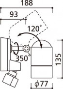 寸法:径φ77 高135 出188首振角度:120度回転角度:350度 重量:0.9kg 材質:●アルミダイカスト(マットシルバー色塗装)|●カバー:強化ガラス(透明) 総W数:50W 省エネ達成率: ランプ名称:レフ形ミニクリプトン球 ランプ本数:1本 光源色: 壁面取付専用|人感センサON/OFF型|センサ部可動:上下15度・左右60度