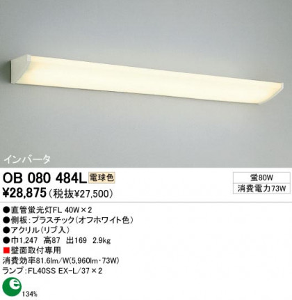 寸法:巾1,247 高87 出169 重量:2.9kg 材質:●側板:プラスチック(オフホワイト色)|●アクリル(リブ入) 総W数:80W 省エネ達成率:1.34 ランプ名称:直管蛍光灯FL ランプ本数:2本 光源色:電球色 壁面取付専用