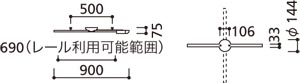 寸法:径φ144 巾33 長900 高75 重量:1.3kg 材質:●アルミダイカスト,アルミ(マットシルバー色塗装) リモコン(連続調光/ON-OFF切替)|白熱灯420W、電球形蛍光灯12〜120Wまで(但し、最大8灯まで)|取付可能器具総重量5(kg)(レール端部2(kg))まで