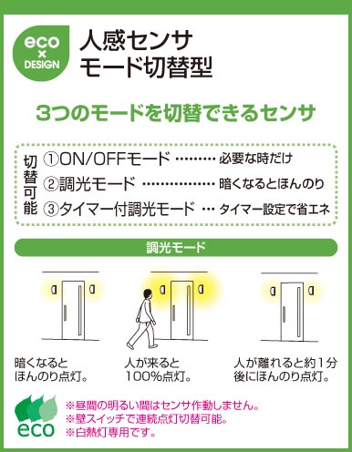 寸法:径φ130 高125 重量: 材質:●鋼(オフホワイト色塗装) 総W数:0W 省エネ達成率: ランプ名称: ランプ本数:0本 光源色: 独立型人感センサモード切替型|天井面取付専用|白熱灯専用20〜60Wまで|センサ部可動範囲:下向き60°/ 左右338°|6時間タイマー付|壁スイッチで8時間連続点灯可能