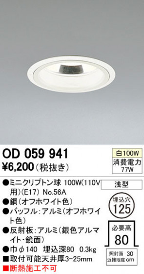 寸法:径φ140 出4 重量:0.3kg 材質:●鋼(オフホワイト色塗装)|●バッフル:アルミ(オフホワイト色塗装)|●反射板:アルミ(銀色アルマイト・鏡面) 総W数:100W 省エネ達成率: ランプ名称:ミニクリプトン球 ランプ本数:1本 光源色: 照射面近接限度30(cm)