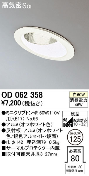 寸法:径φ142 出6 重量:0.5kg 材質:●アルミ(オフホワイト色塗装)|●反射板:アルミ(オフホワイト色塗装/銀色アルマイト・鏡面) 総W数:60W 省エネ達成率: ランプ名称:ミニクリプトン球 ランプ本数:1本 光源色: 傾斜取付10°-32°可能 サーマルプロテクター内蔵|照射面近接限度30(cm)