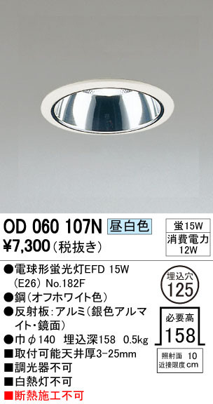 寸法:径φ140 出4 重量:0.5kg 材質:●鋼(オフホワイト色塗装)|●反射板:アルミ(銀色アルマイト・鏡面) 総W数:15W 省エネ達成率: ランプ名称:電球形蛍光灯EFD ランプ本数:1本 光源色:昼白色 照射面近接限度10(cm)