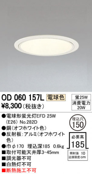 寸法:径φ170 出5 重量:0.6kg 材質:●鋼(オフホワイト色塗装)|●反射板:アルミ(オフホワイト色塗装) 総W数:25W 省エネ達成率: ランプ名称:電球形蛍光灯EFD ランプ本数:1本 光源色:電球色 照射面近接限度10(cm)