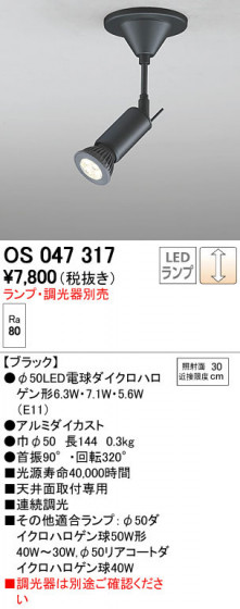 寸法:径φ50 長130 吊高117首振角度:90度(片側)回転角度:320度 重量:0.3kg 材質:●アルミダイカスト(塗装) 総W数:50W 省エネ達成率: ランプ名称:ダイクロハロゲン球 ランプ本数:1本 光源色: 天井面取付専用|照射面近接限度30(cm)|別売ランプ:50W形(40W) (No.)119A・119B・119C50W形(30W) (No.)121A・121B・121C|40Wリアコートランプ使用可能