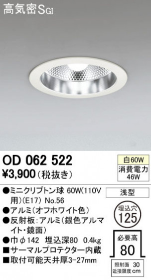 寸法:径φ142 出6 重量:0.4kg 材質:●アルミ(オフホワイト色塗装)|●反射板:アルミ(銀色アルマイト・鏡面) 総W数:60W 省エネ達成率: ランプ名称:ミニクリプトン球 ランプ本数:1本 光源色: サーマルプロテクター内蔵|照射面近接限度30(cm)