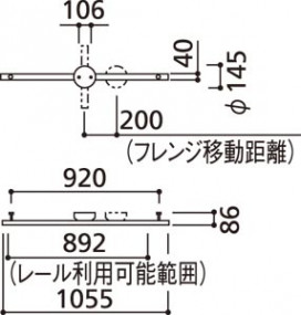 寸法:径φ145 巾40 長1,055 高86 重量:2.2kg 材質:●鋼、アルミ(黒色塗装) 片側200(mm)スライド可能|回転調節90度可能|6Aまで(白熱灯600W、電球形蛍光灯375Wまで)|取付可能器具総重量6(kg)(片側3(kg))まで