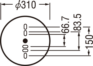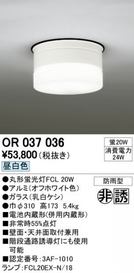 寸法:径φ310 高173 重量:5.4kg 材質:●アルミ(オフホワイト色塗装)|●ガラス(乳白ケシ) 総W数:20W 省エネ達成率: ランプ名称:丸形蛍光灯FCL ランプ本数:1本 光源色:昼白色 認定番号:3AF−1010|併用内蔵型|常時20W(グロー式),非常時55%点灯|充電モニター付|壁面・天井面取付兼用|”同タイプ一般器具:OG 041 036”