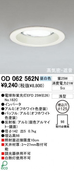 寸法:径φ142 出5 重量:0.7kg 材質:●アルミ(オフホワイト色塗装)|●バッフル:アルミ(オフホワイト色塗装)|●反射板:アルミ(銀色アルマイト・鏡面) 総W数:25W 省エネ達成率: ランプ名称:電球形蛍光灯EFD ランプ本数:1本 光源色:昼白色 照射面近接限度10(cm)