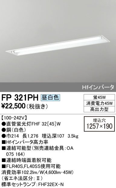 寸法:径1,276×214 出8 重量:3.5kg 材質:●鋼(白色塗装)|●反射板:鋼(白色塗装) 総W数:45W 省エネ達成率: ランプ名称:直管蛍光灯FHF ランプ本数:1本 光源色:昼白色 Hfインバータ高力率|”連結可能型(別売連結金具:OA 075 164)”|連結時端面着脱可能|使用可能ランプ:FLR40S(81.1lm/w)FL40SS(81.1lm/w)