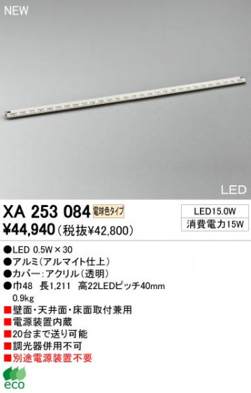 寸法:巾48 長1,211 高22LEDピッチ40(mm) 重量:0.9kg 材質:●アルミ(アルマイト仕上)|●カバー:アクリル(透明) 総W数:15W 省エネ達成率: ランプ名称:LED ランプ本数:30本 光源色:電球色タイプ 壁面・天井面・床面取付兼用|電源装置内蔵|20台まで送り可能