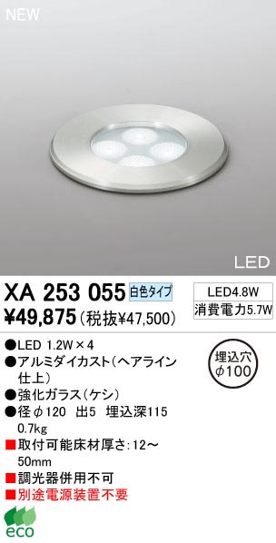 寸法:径φ120 出5 埋込深115 重量:0.7kg 材質:●アルミダイカスト(ヘアライン仕上)|●強化ガラス(ケシ) 総W数:4.8W 省エネ達成率: ランプ名称:LED ランプ本数:4本 光源色:白色タイプ 取付可能床材厚さ:12〜50(mm)