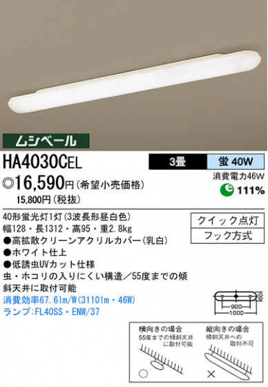 蛍光灯40W 3畳 クイック点灯 フック方式 40形蛍光灯1灯(3波長形昼白色) 幅128・長1312・高95・重2.8kg 高拡散クリーンアクリルカバー乳白 ホワイト仕上 低誘虫UVカット仕様