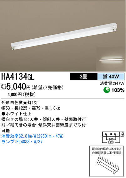 ●縦向きの場合:傾斜天井面55度まで取付可能 消費効率62.8lm/W2950lm・47W ランプ:FL40SS・W/37
