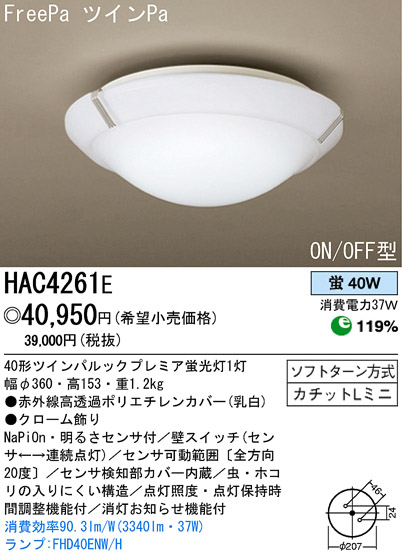 ●消灯お知らせ機能付 消費効率90.3lm/W(3340lm・37W) ランプ:FHD40ENW/H FreePa ツインPa ON/OFF型