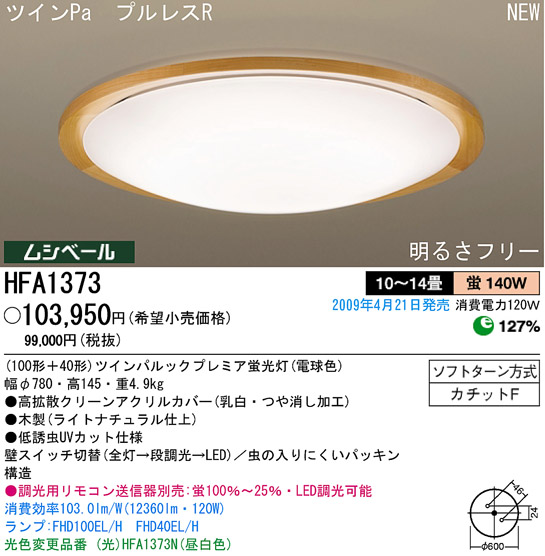 ●光色変更品番 (光)HFA1373N(昼白色) ツインPa プルレスR NEW 明るさフリー