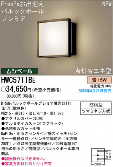 蛍光灯(電球色)15W 防雨型 ツマミネジ方式 D15形パルックボールプレミア蛍光灯1灯(E17)(電球色) 幅215・高215・出しろ110・重1.6kg アクリルカバー乳白 アルミダイカスト(オフブラック) 低誘虫UVカット仕様