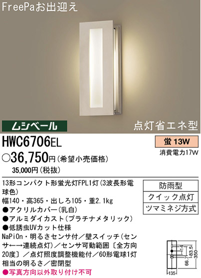 蛍光灯(電球色)13W 防雨型 クイック点灯 ツマミネジ方式 13形コンパクト形蛍光灯FPL1灯(3波長形電球色) 幅140・高365・出しろ105・重2.1kg アクリルカバー乳白 アルミダイカスト(プラチナメタリック) 低誘虫UVカット仕様