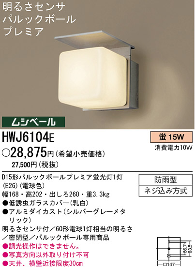 蛍光灯(電球色)15W 防雨型 ネジ込み方式 D15形パルックボールプレミア蛍光灯1灯(E26)(電球色) 幅168・高202・出しろ260・重3.3kg 低誘虫ガラスカバー乳白 アルミダイカスト(シルバーグレーメタリック)