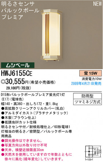 蛍光灯(電球色)15W 防雨型 ツマミネジ方式 D15形パルックボールプレミア蛍光灯1灯(E17)(電球色) 幅140・高360・出しろ172・重1.8kg 高拡散クリーンアクリルカバー乳白 アルミダイカスト(プラチナメタリック) 木製(ブラウン仕上) 低誘虫UVカット仕様