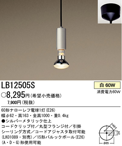 白熱灯60W 60形ナローレフ電球1灯(E26) 幅φ62・高163・全高1000・重0.4kg シルバーメタリック仕上