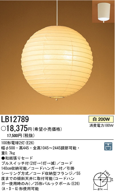 白熱灯200W 100形電球2灯(E26) 幅φ500・高445・全高1045〜2445調節可能・重0.7kg 和紙張りセード