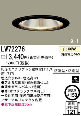 白熱灯60W 防湿型・防雨型 60形ミニクリプトン電球1灯(110V用)(E17) 埋込穴φ150・埋込高121 アルミ反射板銀色鏡面仕上 強化ガラスパネル(透明) 枠(オフブラックつや消し)