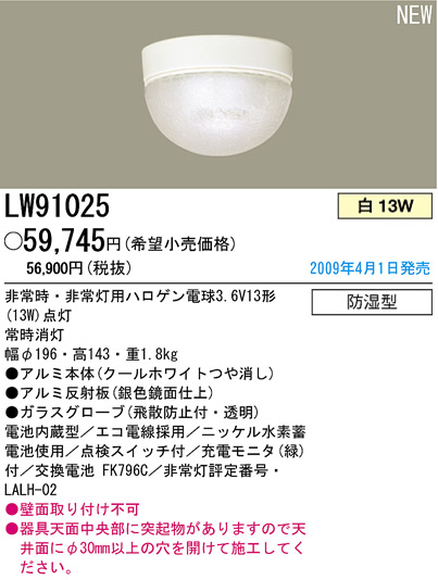 白熱灯13W 環境配慮型 電池内蔵型 防湿型 非常時・非常灯用ハロゲン電球3.6V13形(13W)点灯 常時消灯 幅φ196・高143・重1.8kg 本体:アルミクールホワイトつや消し仕上 反射板:アルミ(銀色鏡面仕上) グローブ:飛散防止付ガラス(透明) 蓄電池:ニッケル水素蓄電池 エコ電線採用 点検スイッチ付 充電モニタ(緑)付