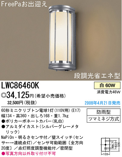 白熱灯60W 防雨型 ツマミネジ方式 60形ミニクリプトン電球1灯(110V用)(E17) 幅134・高360・出しろ168・重1.7kg ポリカーボネートカバー乳白 アルミダイカスト(シルバーグレーメタリック)