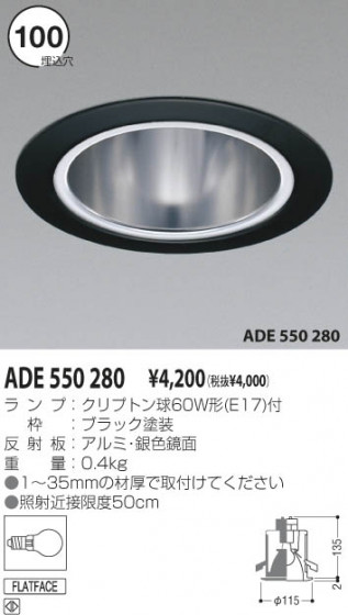 白60W|ランプ:クリプトン球60W形(E17)付|枠:ブラック塗装|反射板:アルミ・銀色鏡面|●幅-φ115 出幅-2 埋込穴径-φ100 埋込高-135 取付必要高-135mm 重-0.4kg|●1〜35mmの材厚で取付けてください|●照射近接限度50cm