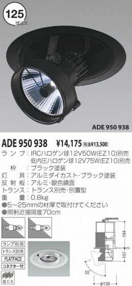 白75W|ランプ:IRCハロゲン球12V50W(EZ10)別売 低内圧ハロゲン球12V75W(EZ10)別売|枠:ブラック塗装|灯具:アルミダイカスト・ブラック塗装|反射板:アルミ・銀色鏡面|トランス:トランス別売・別置型|●幅-φ138 出幅-110 埋込穴径-φ125 埋込高-184 取付必要高-184mm 重-0.8kg|●5〜25mmの材厚で取付けてください|●照射近接限度70cm