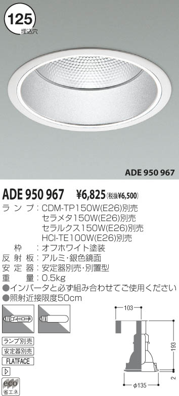 H150W|ランプ:CDM-TP150W(E26)別売 セラメタ150W(E26)別売 セラルクス150W(E26)別売 HCI-TE100W(E26)別売|枠:オフホワイト塗装|反射板:アルミ・銀色鏡面|安定器:安定器別売・別置型|●幅-φ135 出幅-2 埋込穴径-φ125 埋込高-193 取付必要高-193mm 重-0.5kg|●インバータと必ず組み合わせてご使用ください|●照射近接限度50cm