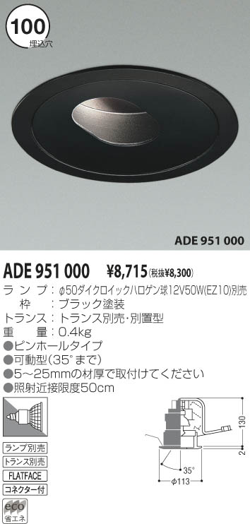 白50W|ランプ:φ50ダイクロイックハロゲン球12V50W(EZ10)別売|枠:ブラック塗装|トランス:トランス別売・別置型|●幅-φ113 出幅-2 埋込穴径-φ100 埋込高-130 取付必要高-130mm 重-0.4kg|●ピンホールタイプ|●可動型(35°まで)|●5〜25mmの材厚で取付けてください|●照射近接限度50cm