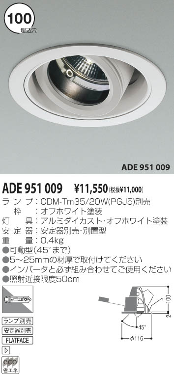 H35/20W|ランプ:CDM-Tm35/20W(PGJ5)別売|枠:オフホワイト塗装|灯具:アルミダイカスト・オフホワイト塗装|安定器:安定器別売・別置型|●幅-φ116 出幅-2 埋込穴径-φ100 埋込高-100 取付必要高-100mm 重-0.4kg|●可動型(45°まで)|●5〜25mmの材厚で取付けてください|●インバータと必ず組み合わせてご使用ください|●照射近接限度50cm